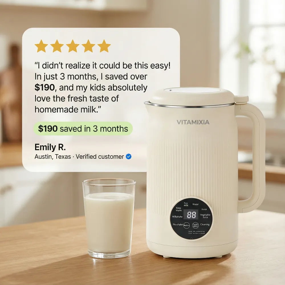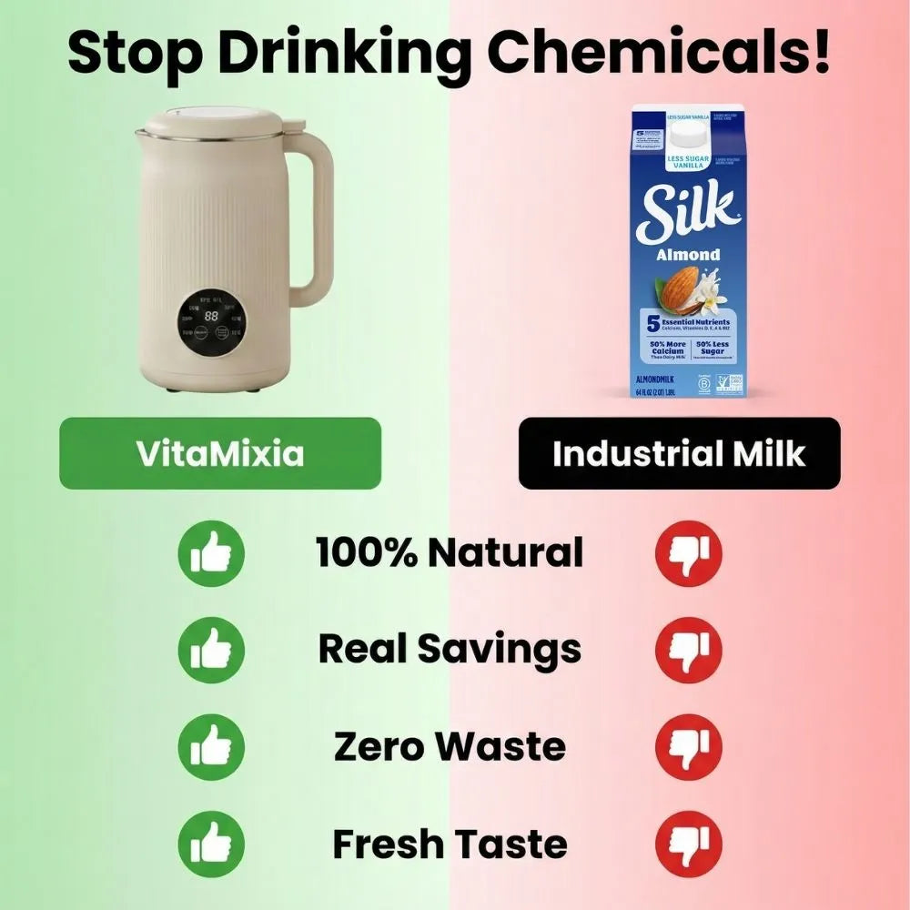 Why spend more on industrial plant-based milk? VitaMixia gives you all the pleasure and creaminess of homemade plant-based milk—with ingredients you choose, no fillers, and no waste. Every time you pour a new drink, you save compared to store-bought options while giving yourself (and your family) a healthier, more affordable, and fully transparent choice.